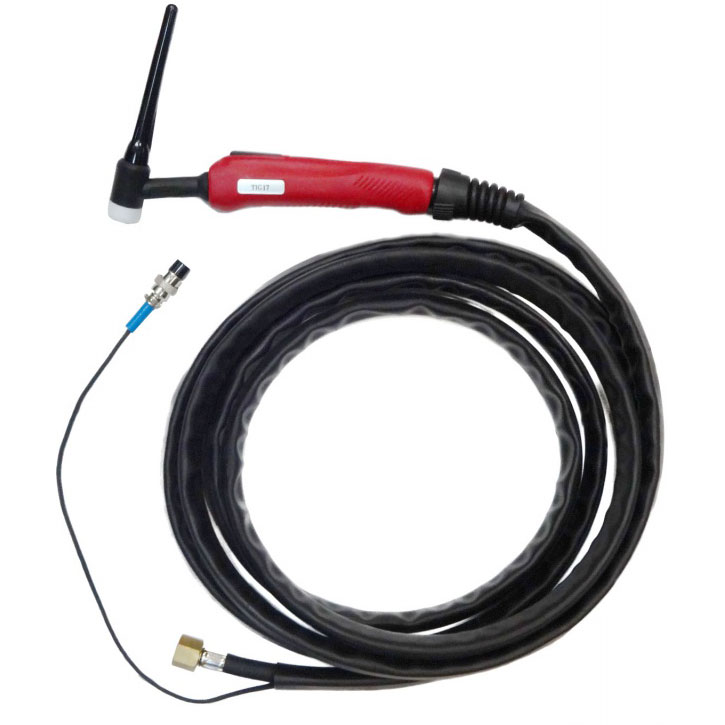 Горелка с усиленным водяным охлаждением, оснащена по ЕВРО стандарту: силовой шланг М12х1, газовый шланг 1/4G, водный шланг 3/8G. В комплекте поставки управляющие разъёмы 2/3/5 pin. Горелка должна дополнительно укомплектовываться силовым разъемом TIG PLUG 50 со шлангом на воду 0.6м с соединителем 3/8G