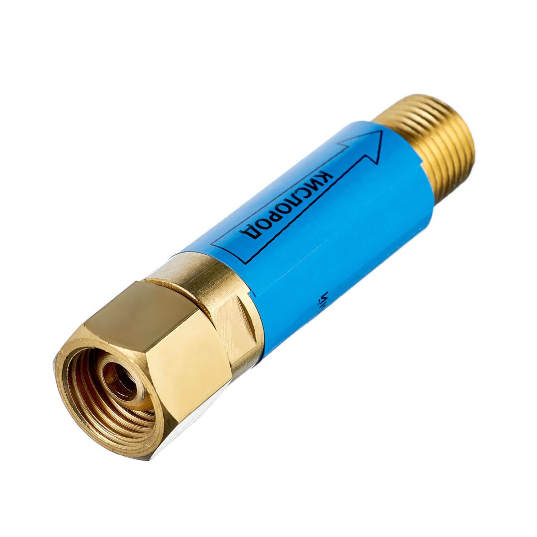 Клапан КОК предназначен для защиты кислородных рукавов от разрывов и возгорания при обратных ударах пламени, устанавливается на штуцер К резака или горелки, присоединительная резьба М16х1,5LH