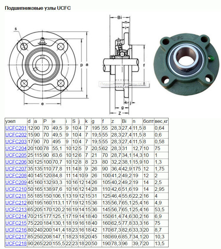 Подшипниковый узел UCFC211 состоит из шарикового радиального подшипника UC211 и корпуса FC211, который по форме круг. Эти отдельные две части могут входить и в состав других подшипниковых узлов (например такой же подшипник в UCF211 и корпус в UKP211), продажа узла UCFC211 осуществляется как в собранном виде. Таблица разных типов подшипниковых узлов. Изделия размерной серии UCP2.. — самые легкие (есть также UCPX.. и UCP3.., которые имеют такие же посадочные размеры, но большие габариты) и предназначены для нормальных условий эксплуатации. Узлы отличаются бесшумной работой и возможностью воспринимать как радиальные, так и, в меньшей степени, осевые нагрузки, также как и обычные радиальные шарикоподшипники.