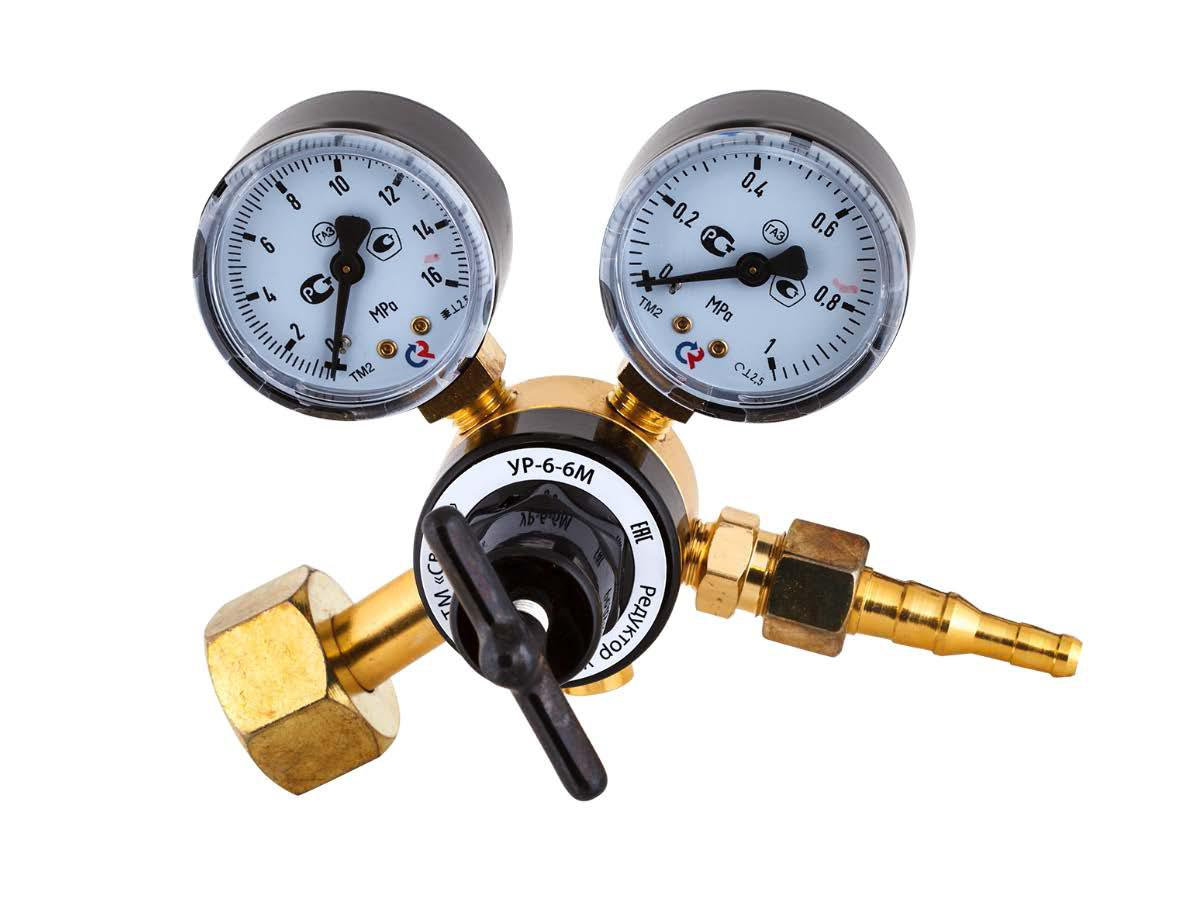 Редуктор баллонный (углекислотный), наибольшая пропускная способность 6 м3/ч, макс. давление на входе 10 МПа, макс. давление на выходе 0,6 МПа, вес 0,75 кг, латунь