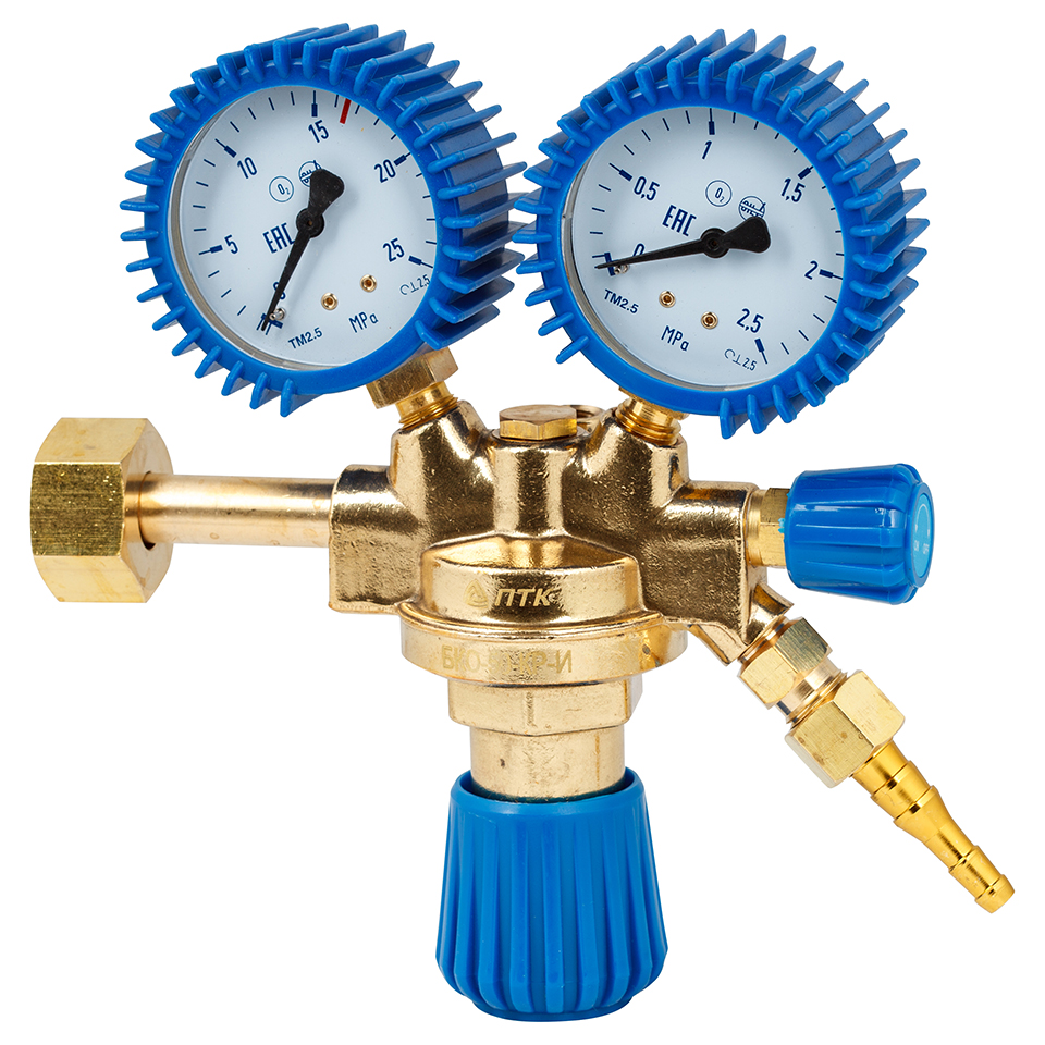 Редуктор баллонный (кислородный), крупногабаритный, наибольшая пропускная способность 50 м3/ч, макс. давление на входе 20 МПа, макс. давление на выходе 1,25 МПа, вес 1,2кг, латунь